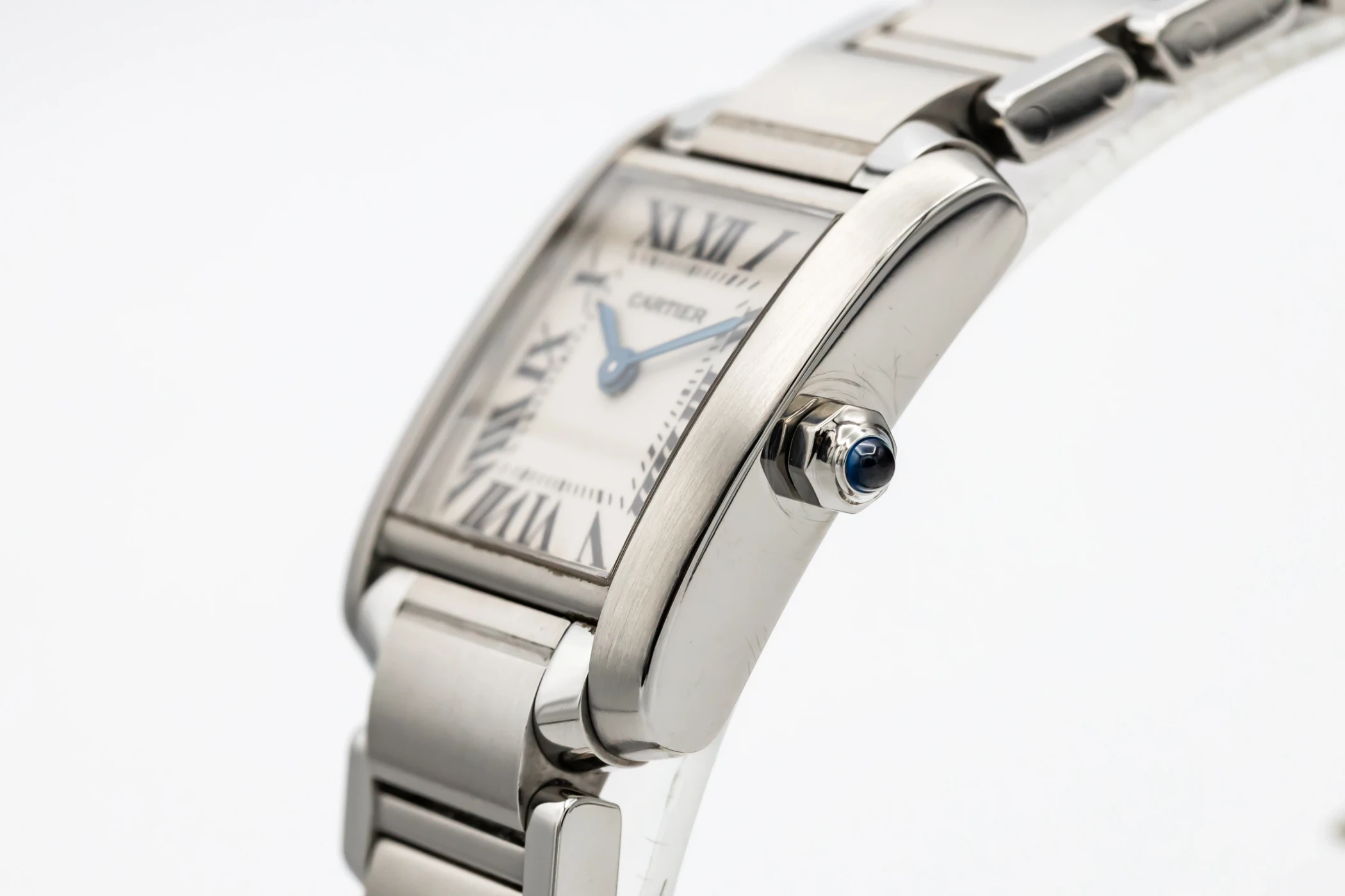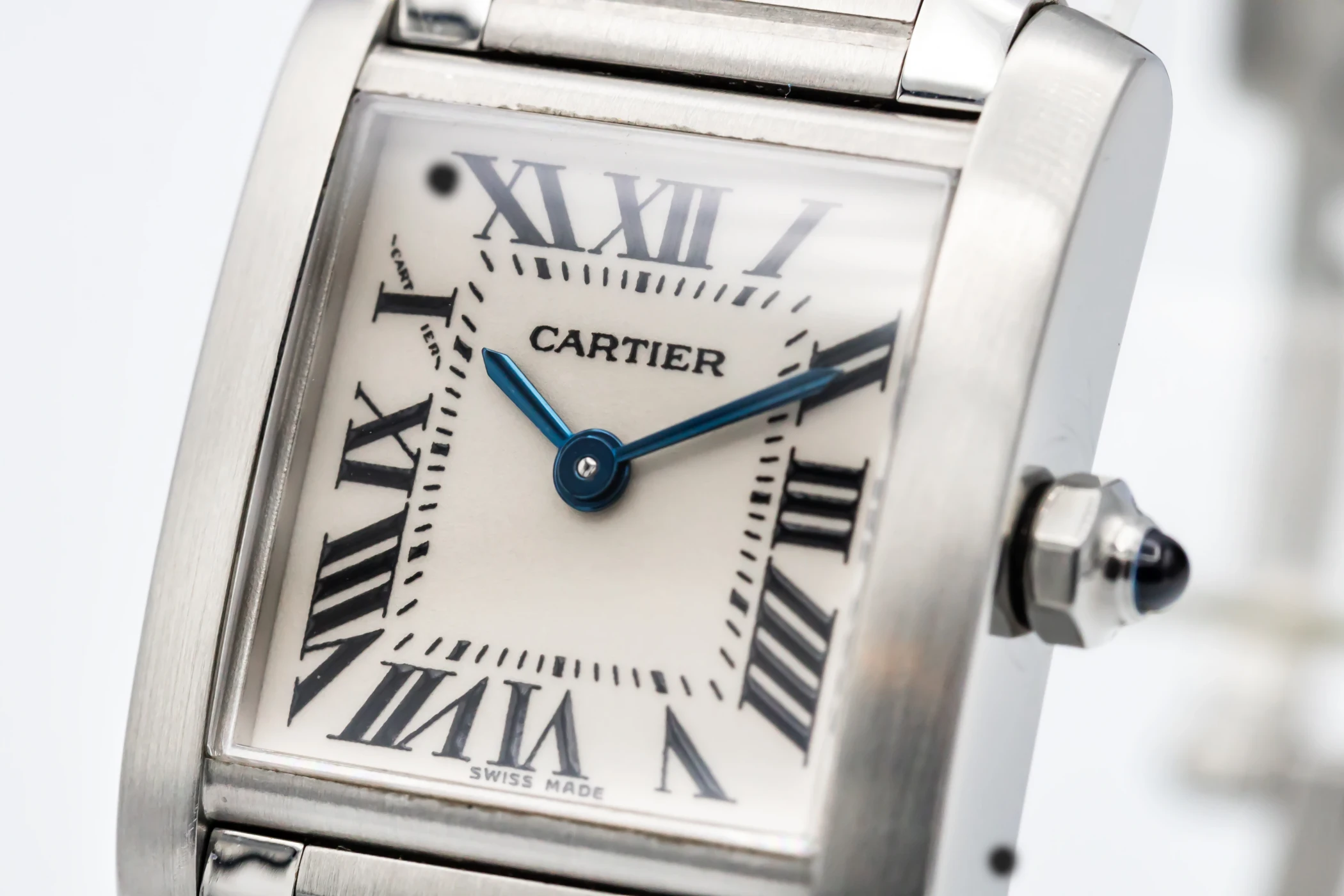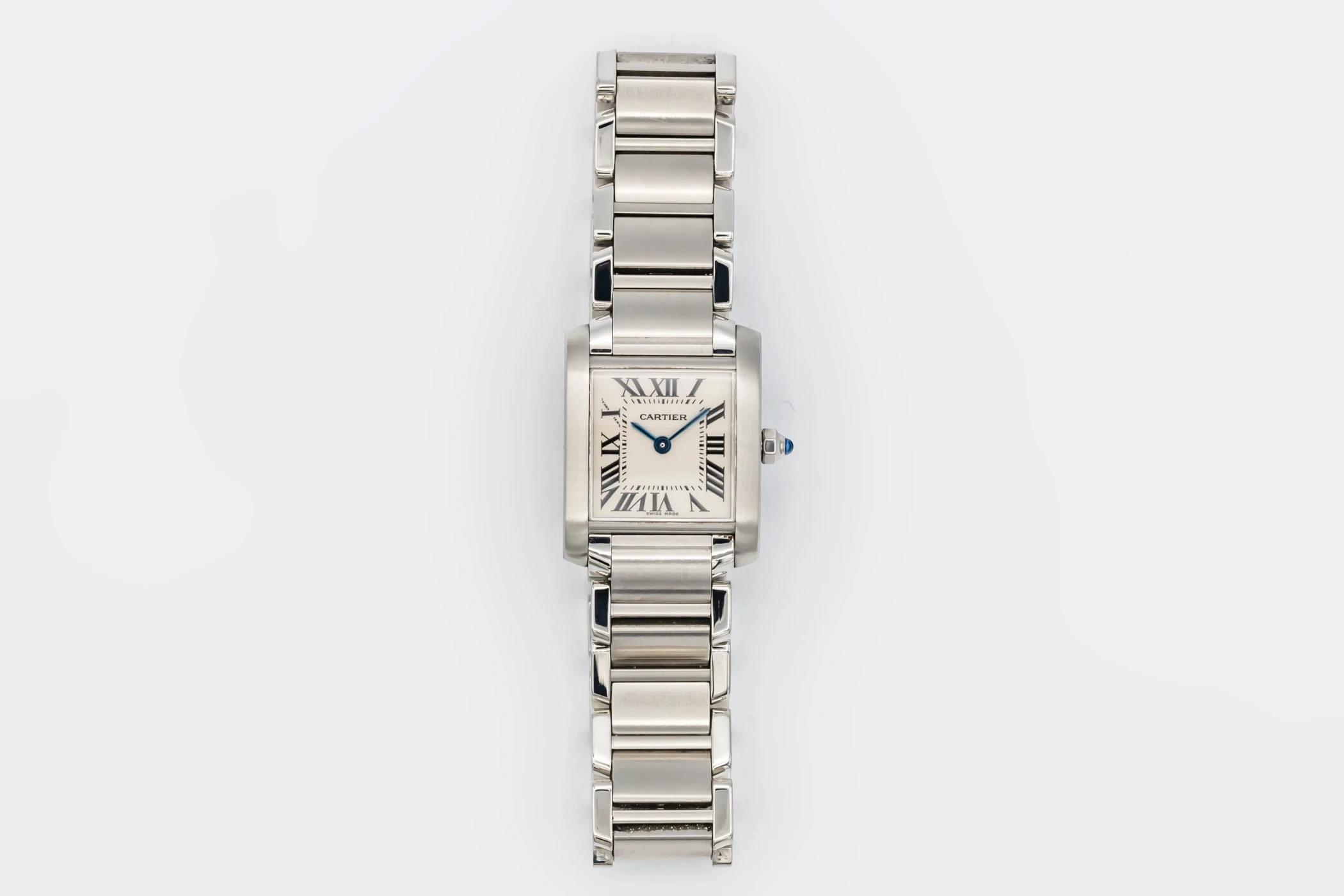 This 2010 Cartier Tank Franciase 20mm features a silver dial with roman numeral markers. It also features a 18ct white gold bracelet and a factory diamond bezel.